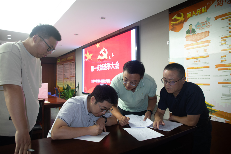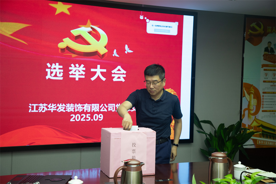 在莊嚴肅穆的國歌聲中,換屆選舉環節正式開始。會議宣讀了集團黨委關于同意華發黨總支召開黨員大會進行換屆選舉及候選人名單的批復,會議審議并通過了《籌備工作報告》、《中共江蘇華發裝飾有限公司總支委員會選舉辦法》、候選人名單、監票人及計票人名單。隨后,大會嚴格按照選舉程序,以無記名投票、差額選舉的方式,進行了現場投票。經公正計票,選舉產生陳明、朱崢光、朱明星、趙宏貴、李紅雨、徐家匯、顏吉利等7位同志為新一屆黨總支委員會委員。